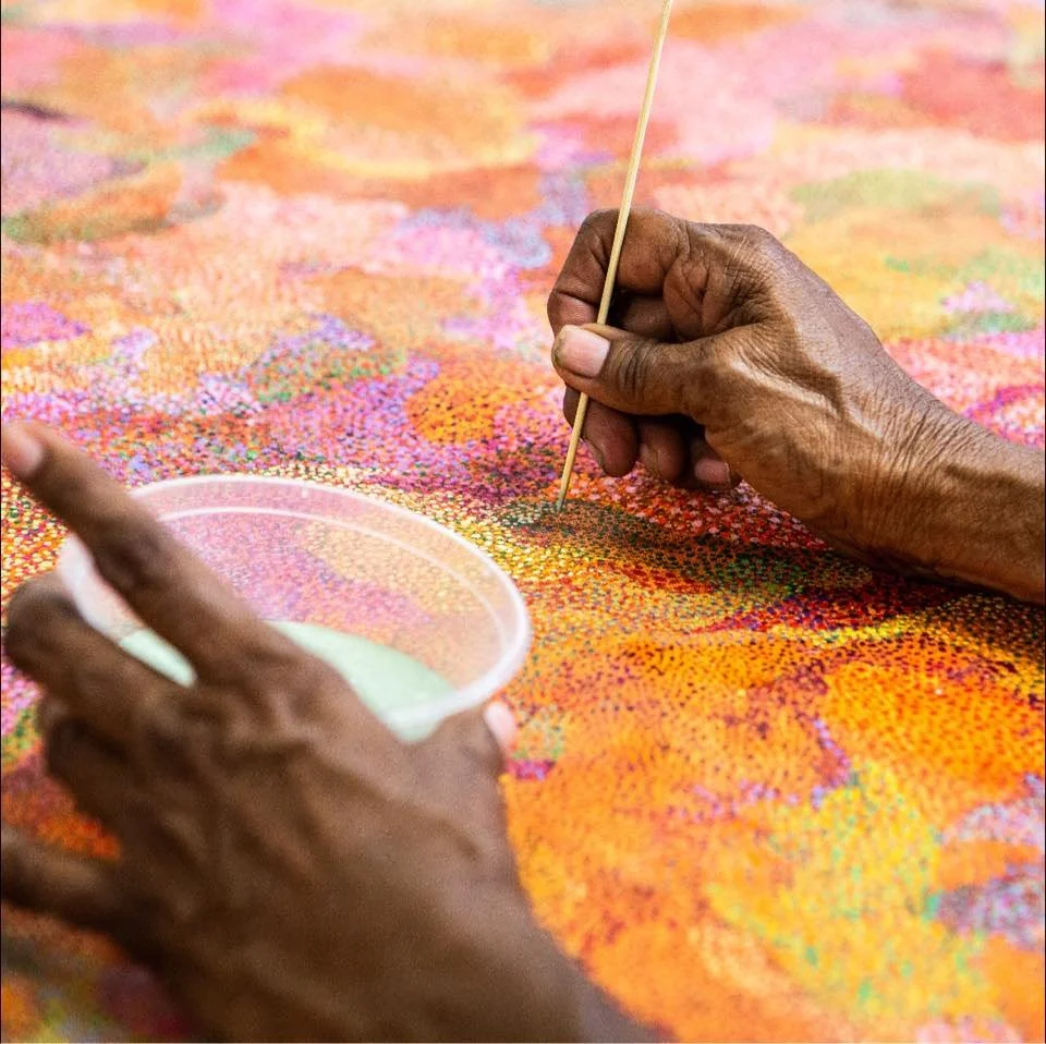 Based in Roebourne, a small town in Western Australia’s Pilbara region of the north-west of the state, the Yinjaa-Barni artists create deeply personal works of collective memory, rendering the wildflowers, river systems and landforms of their country onto canvas.